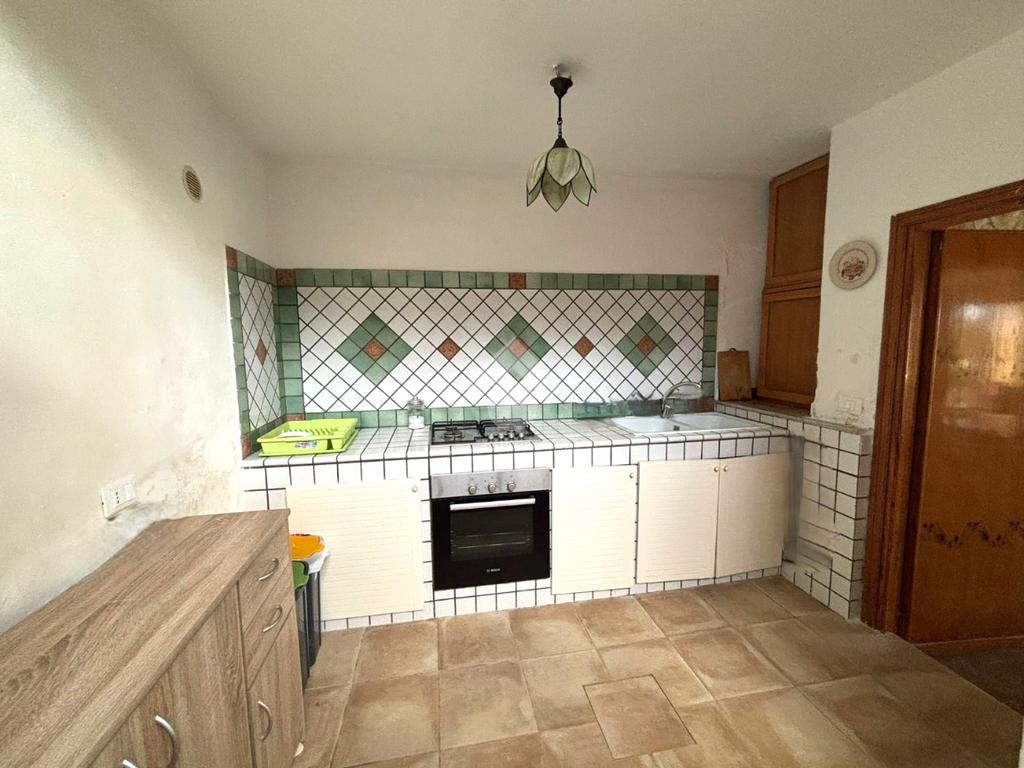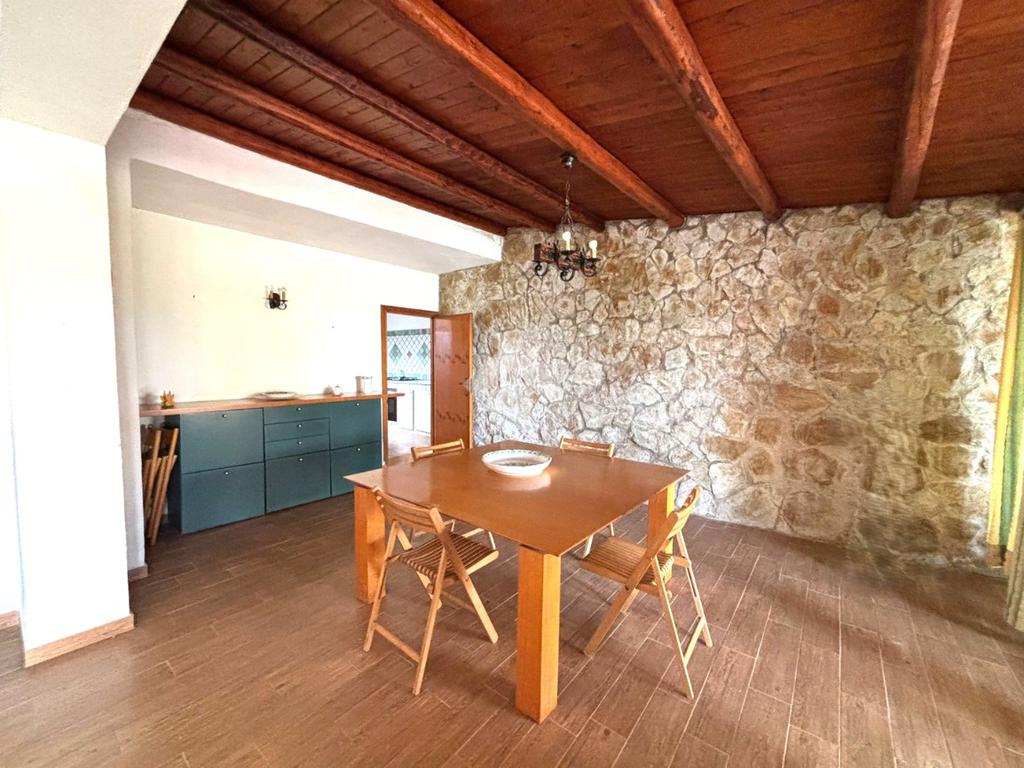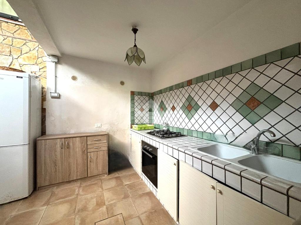 L’ingresso interno si apre su una zona living ampia e luminosa, seguita da una cucina con angolo cottura in muratura.